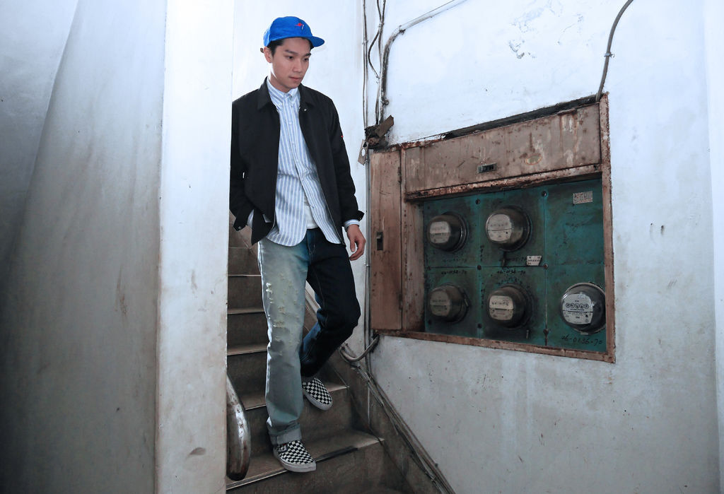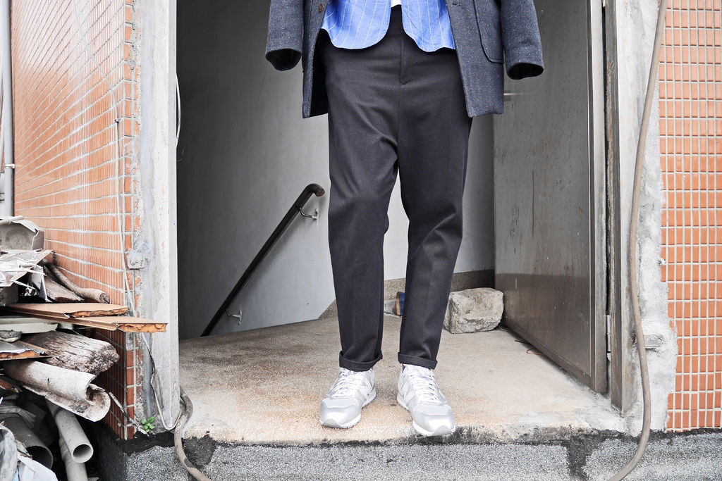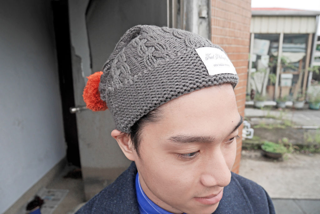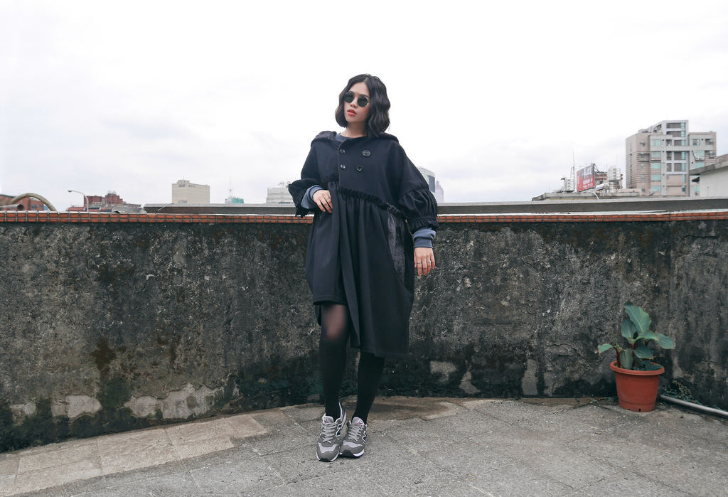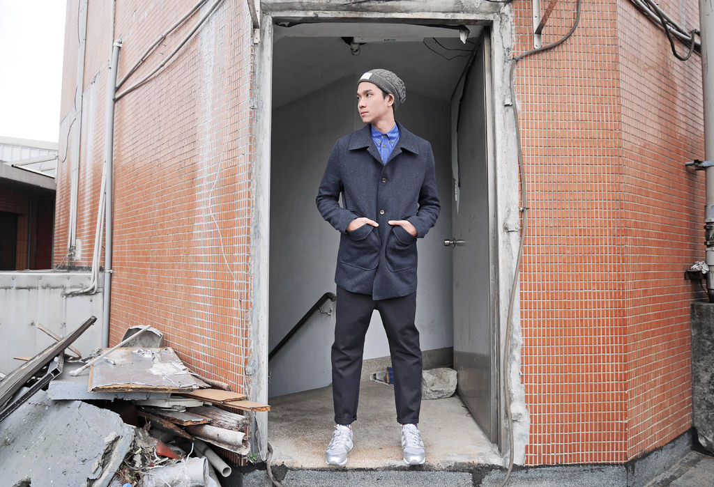 這身搭配利用輕成熟的單品羊毛外套與休閒西裝褲,搭配休閒的單品毛帽與慢跑鞋,
