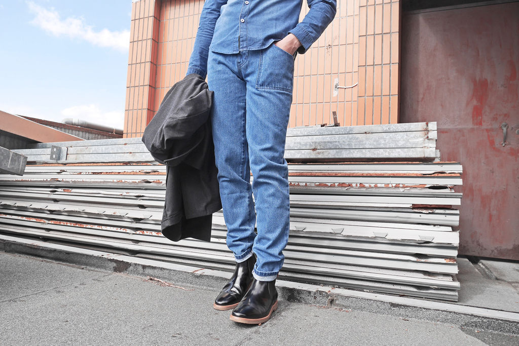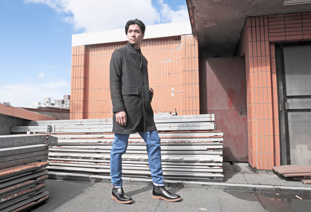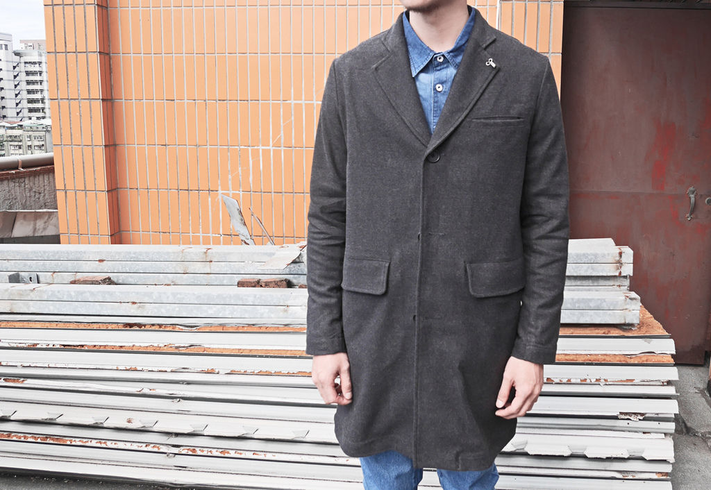 這身搭配利用長板查斯特大衣與水洗藍牛仔褲呈現出帶點復古感的休閒紳士造型,