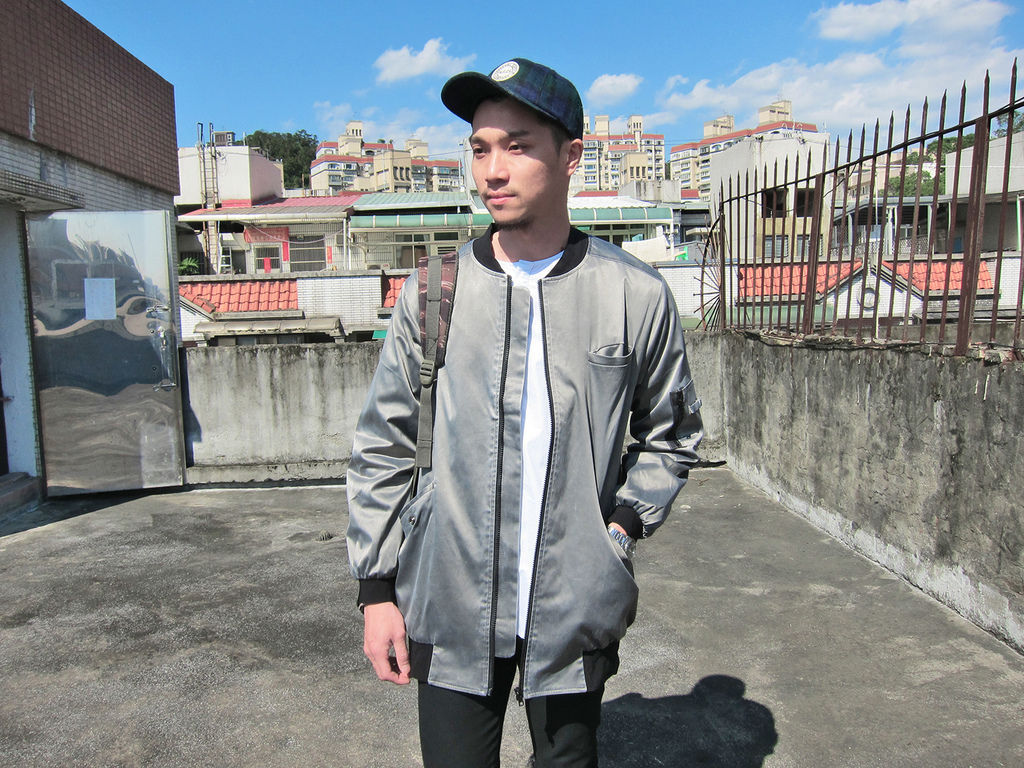 在穿搭上也以簡單的黑白配,外套選擇長版MA-1軍外套,