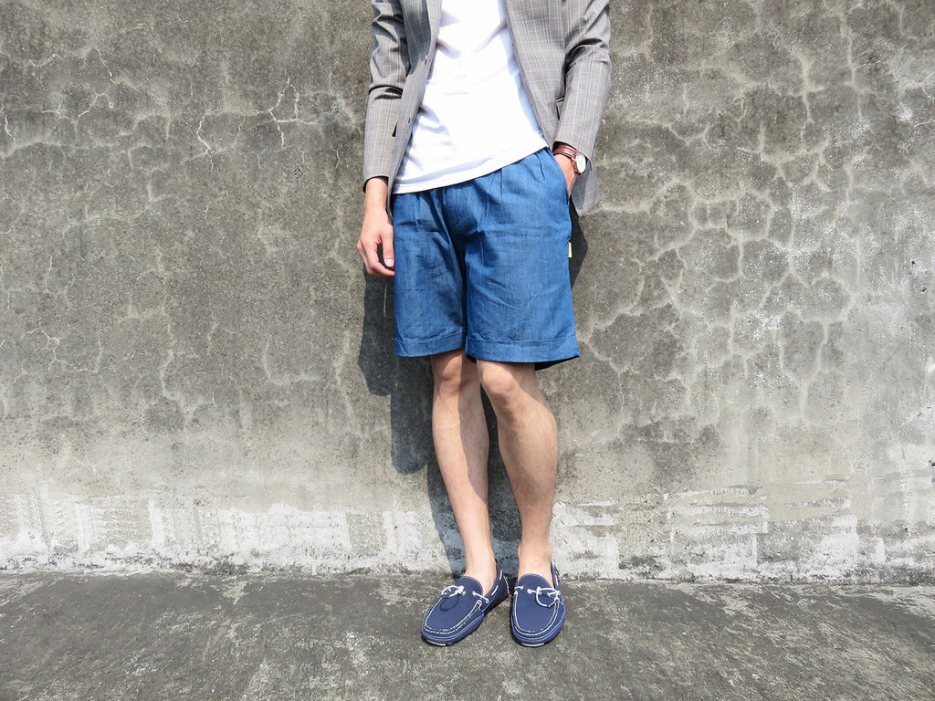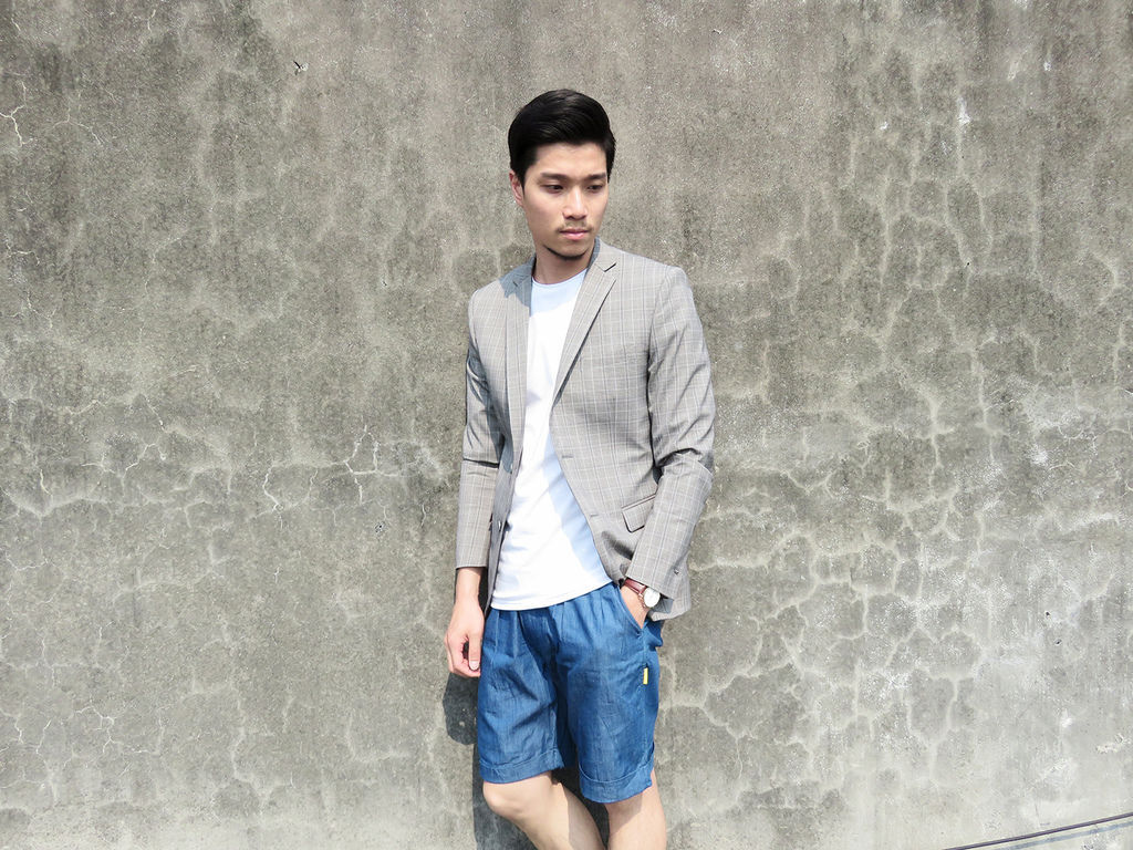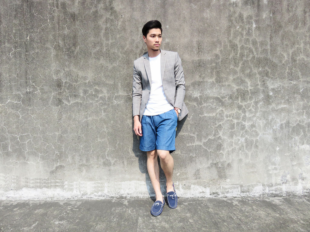 這套搭配是比較休閒紳士的穿搭,利用短褲跟西裝外套的組合,
