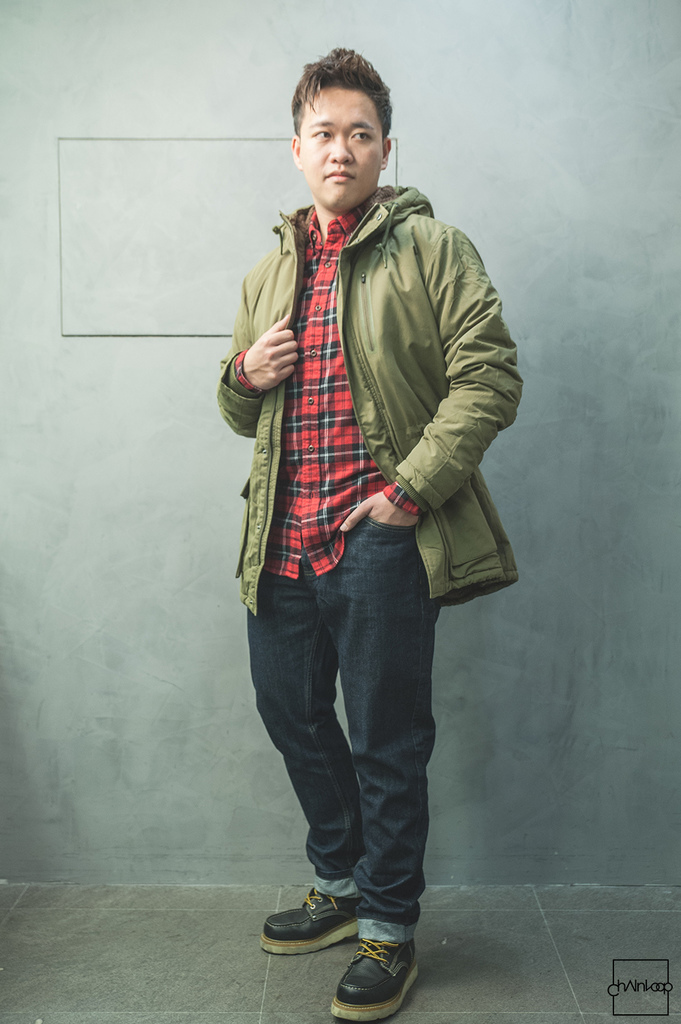 簡單的法蘭絨格紋襯衫配上軍外套下身一條原色牛仔褲與工作靴,