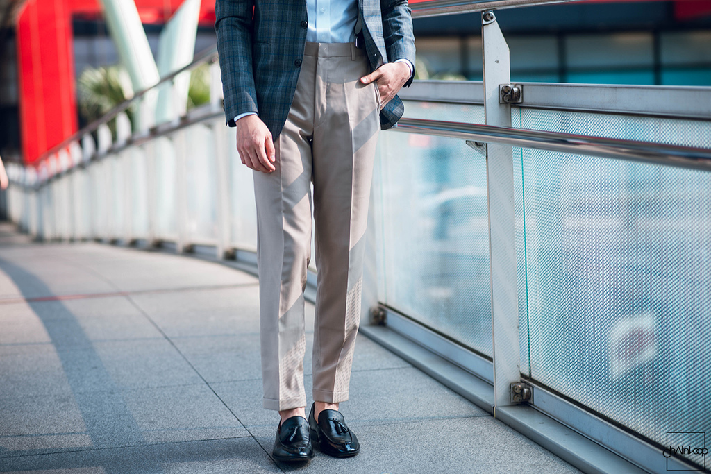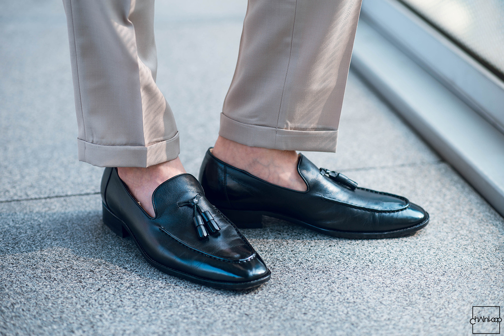 下身換成卡其色西褲,在褲腳上訂製出反摺細節長度落在九分高度加強休閒感配上樂福鞋,