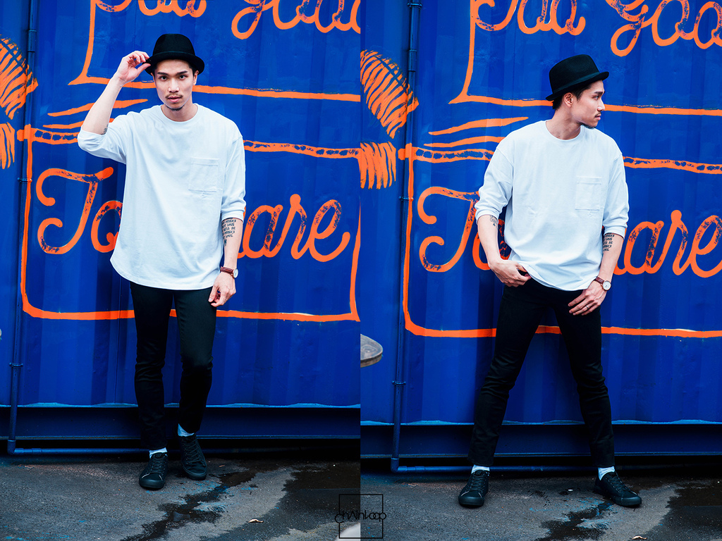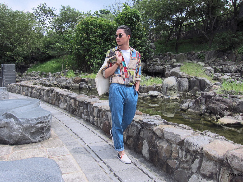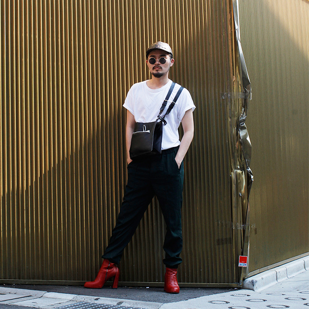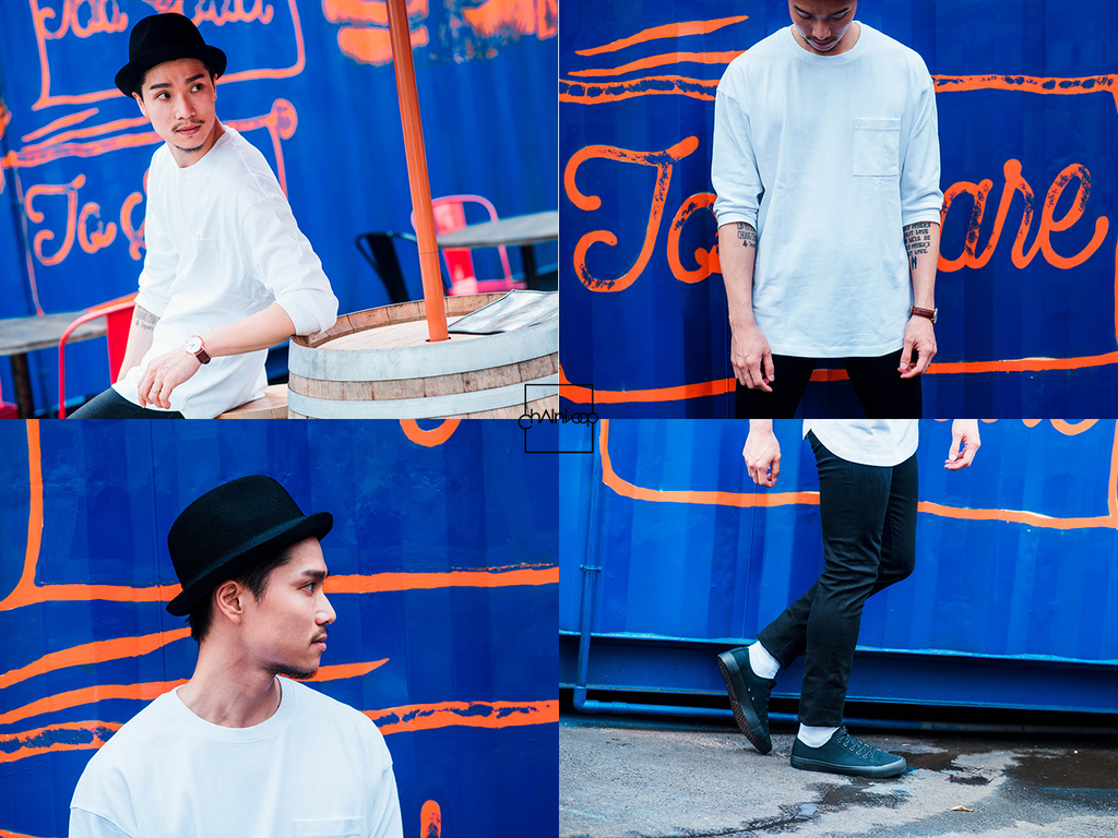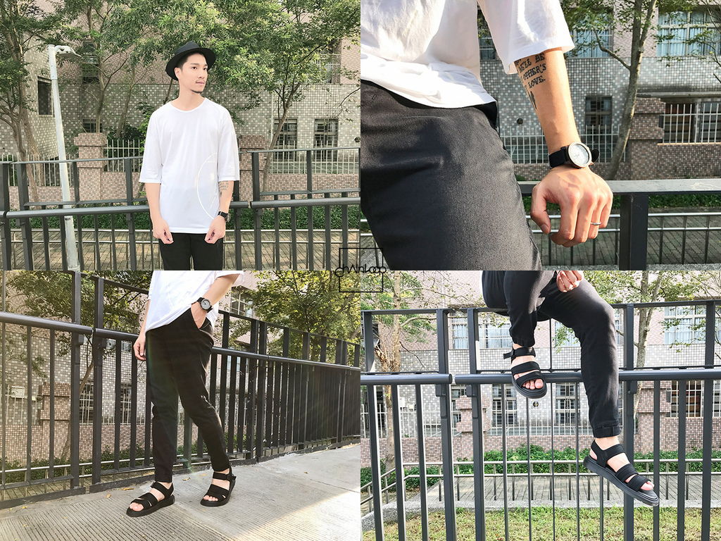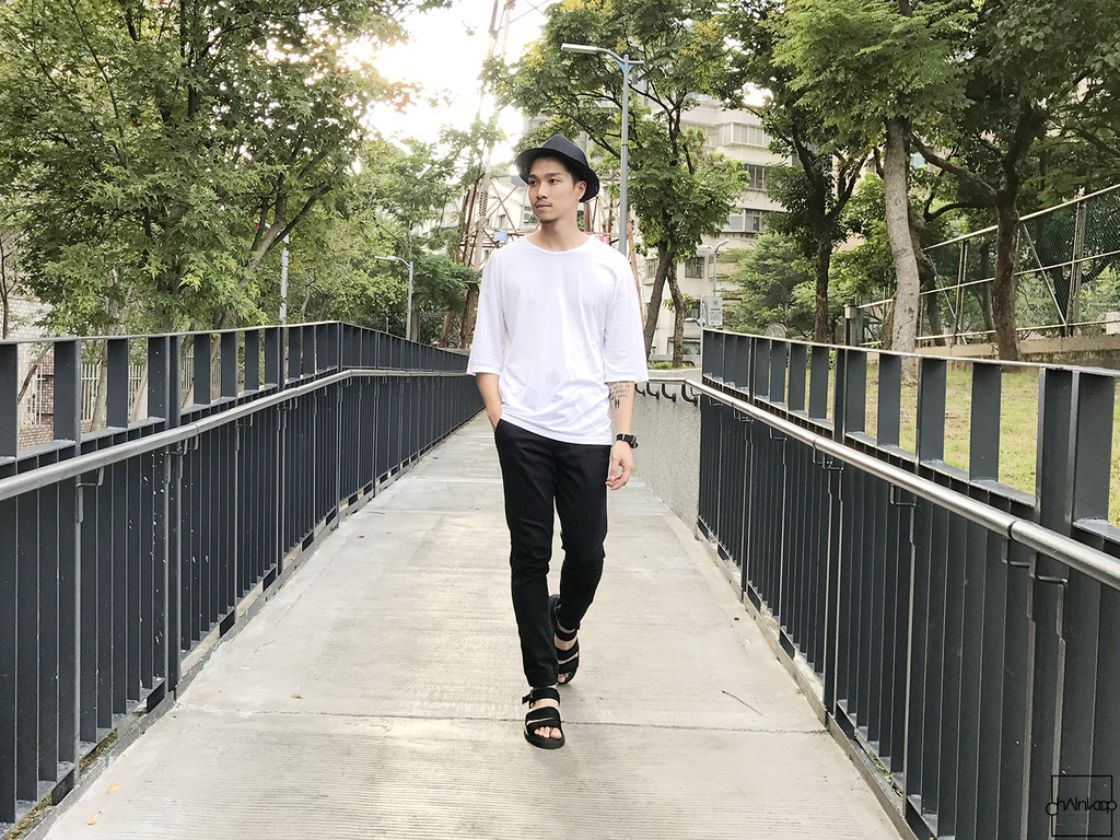 上衣:Chainloop / 褲子:Uniqlo / 涼鞋:Dr. Martens / 帽子:25togo